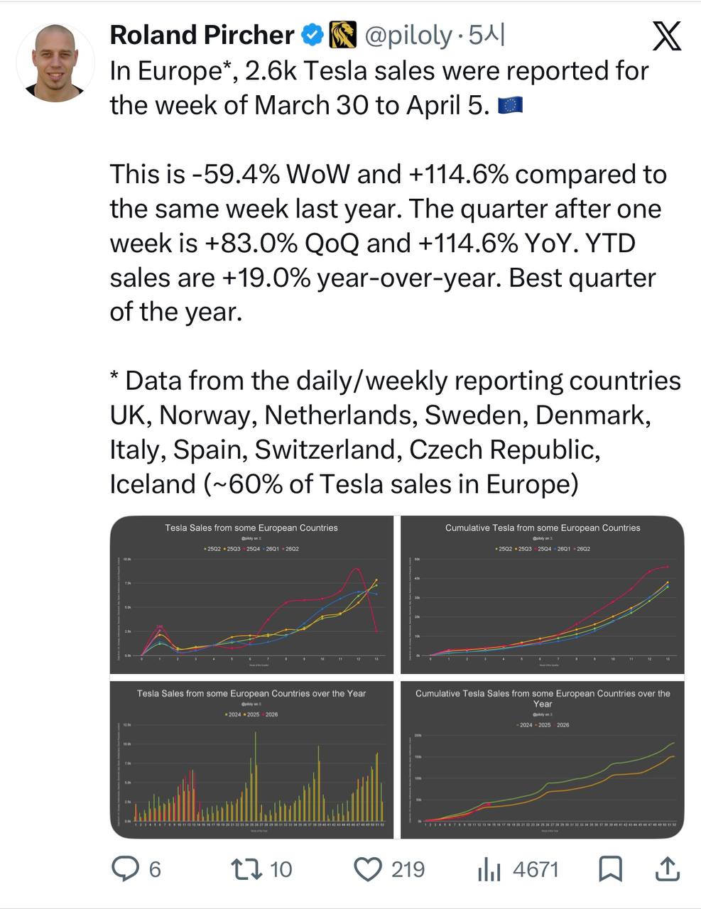 유럽 지역 테슬라 판매량은 단기적으로 주간 판매 감소를 겪었으나, 전년 동기 및 전분기 대비 큰 폭의 성장을 기록하며 연간 누계 실적 또한 긍정적인 흐름을 보인다.
