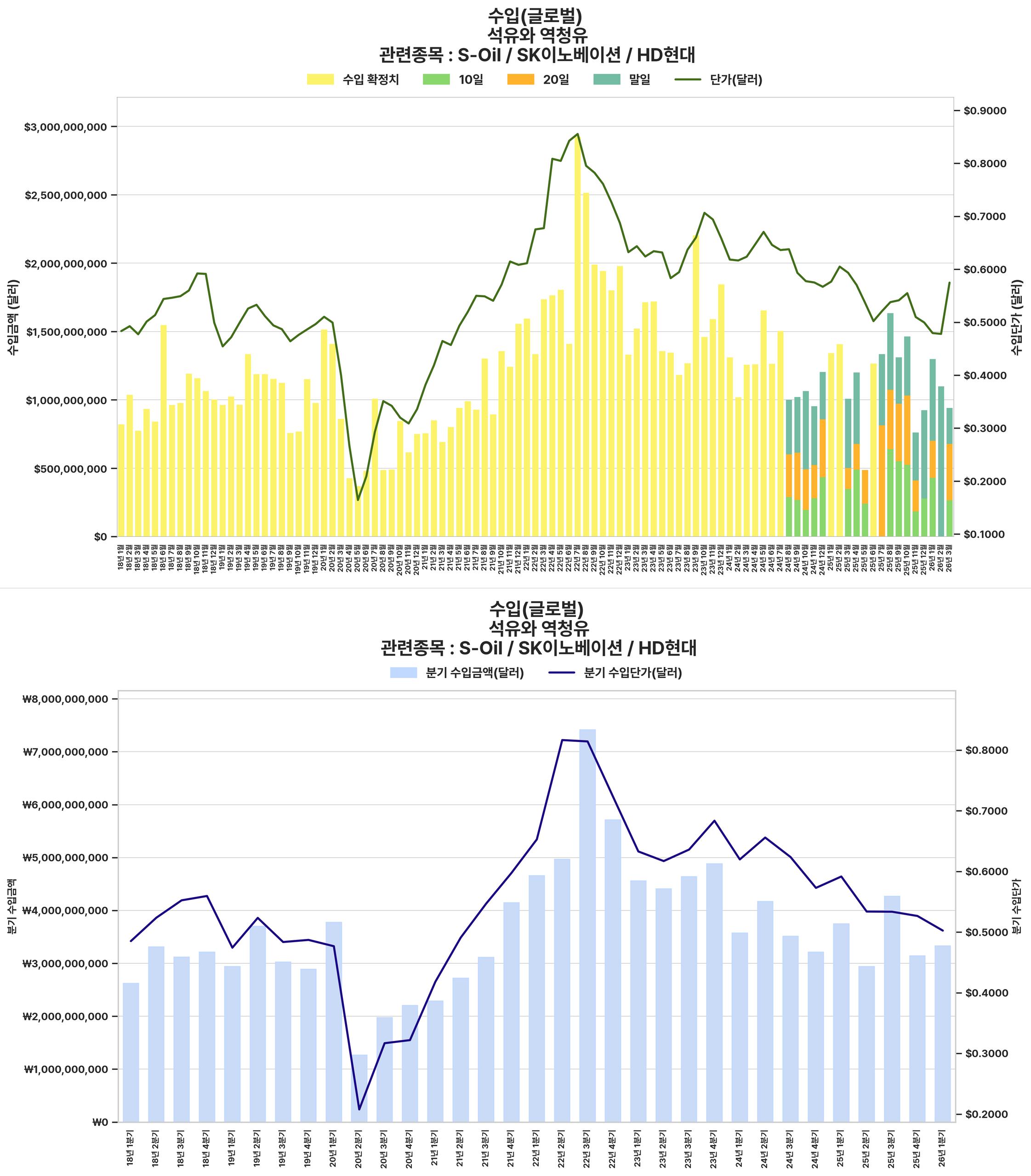 최근 분기 석유 및 역청유 수입 단가와 수입 금액이 모두 증가하며 유가 상승 및 제품 수요 강세를 시사. 이는 정유사의 재고 평가 이익 및 마진 개선에 긍정적인 영향을 미칠 것으로 예상됨.