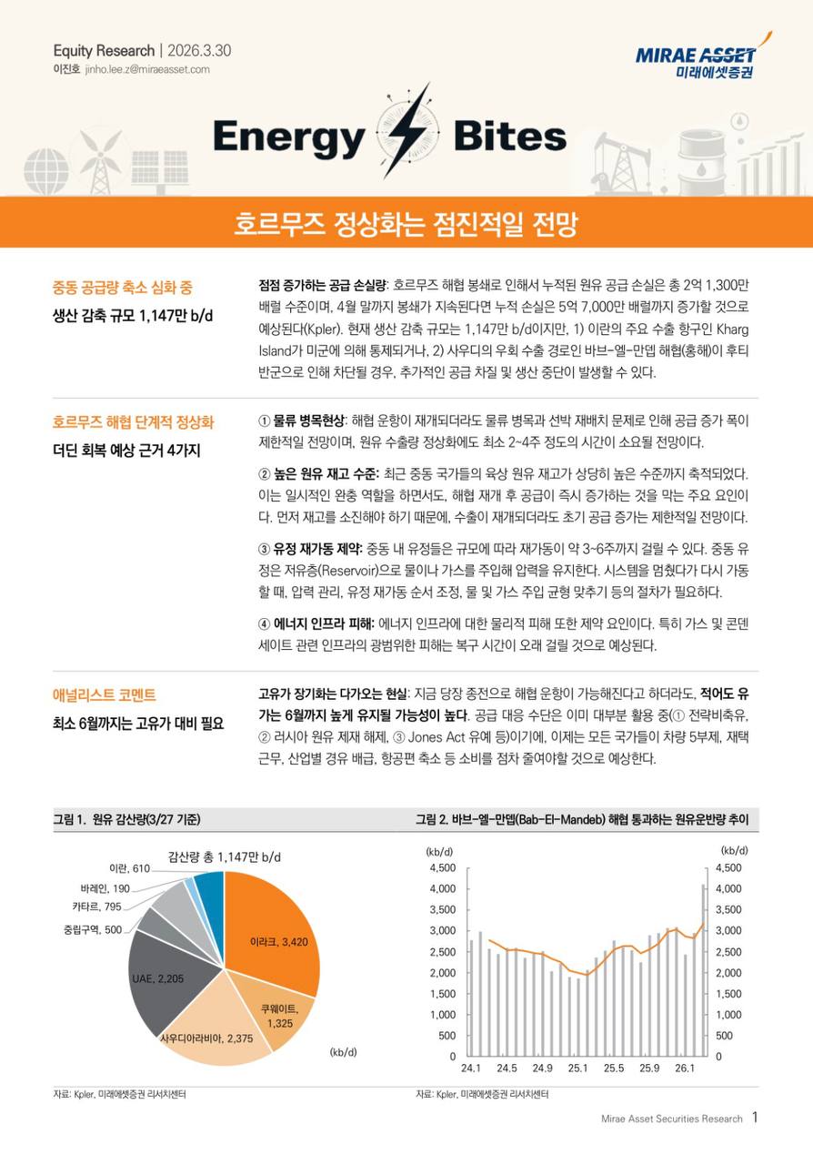 호르무즈 해협 정상화는 점진적으로 진행될 것으로 예상되며, 원유 공급 차질과 높은 재고, 인프라 피해 등으로 인해 고유가 현상이 최소 6개월 이상 지속될 가능성이 높다.