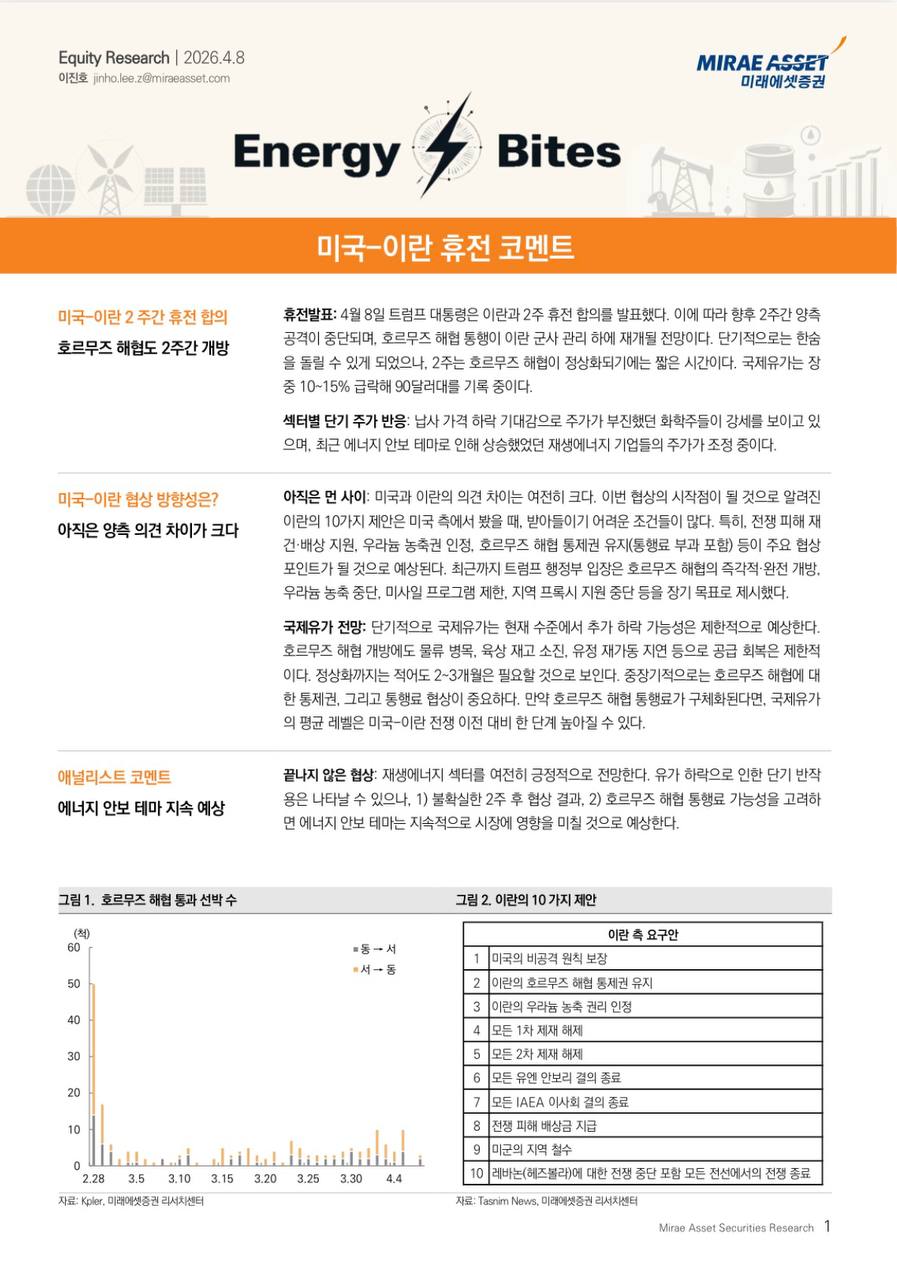 미국-이란 휴전 합의로 국제유가가 단기 급락 후 안정화될 것으로 예상되며, 원가 하락 기대로 화학 산업은 긍정적이나 재생에너지 산업은 조정 흐름을 보임.
