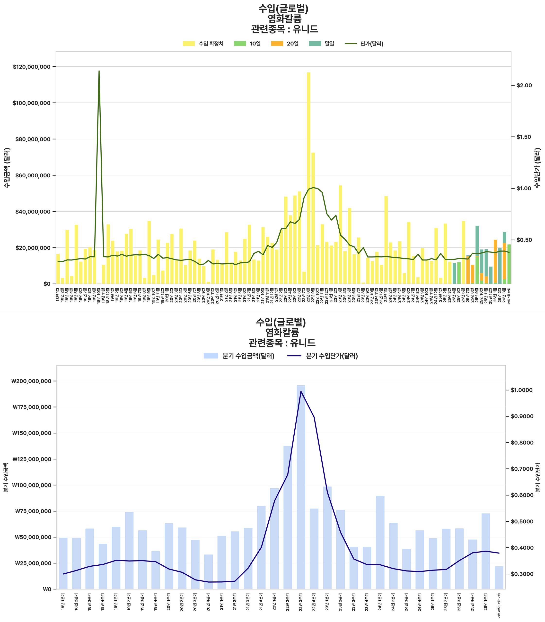 글로벌 영화칼륨 수입량이 2025년 중반 이후 점진적으로 증가하고 있으며, 수입 단가 또한 하락세를 멈추고 안정화되어 유니드의 관련 화학 제품 매출액 증가 및 수익성 개선에 긍정적인 영향을 줄 수 있음.