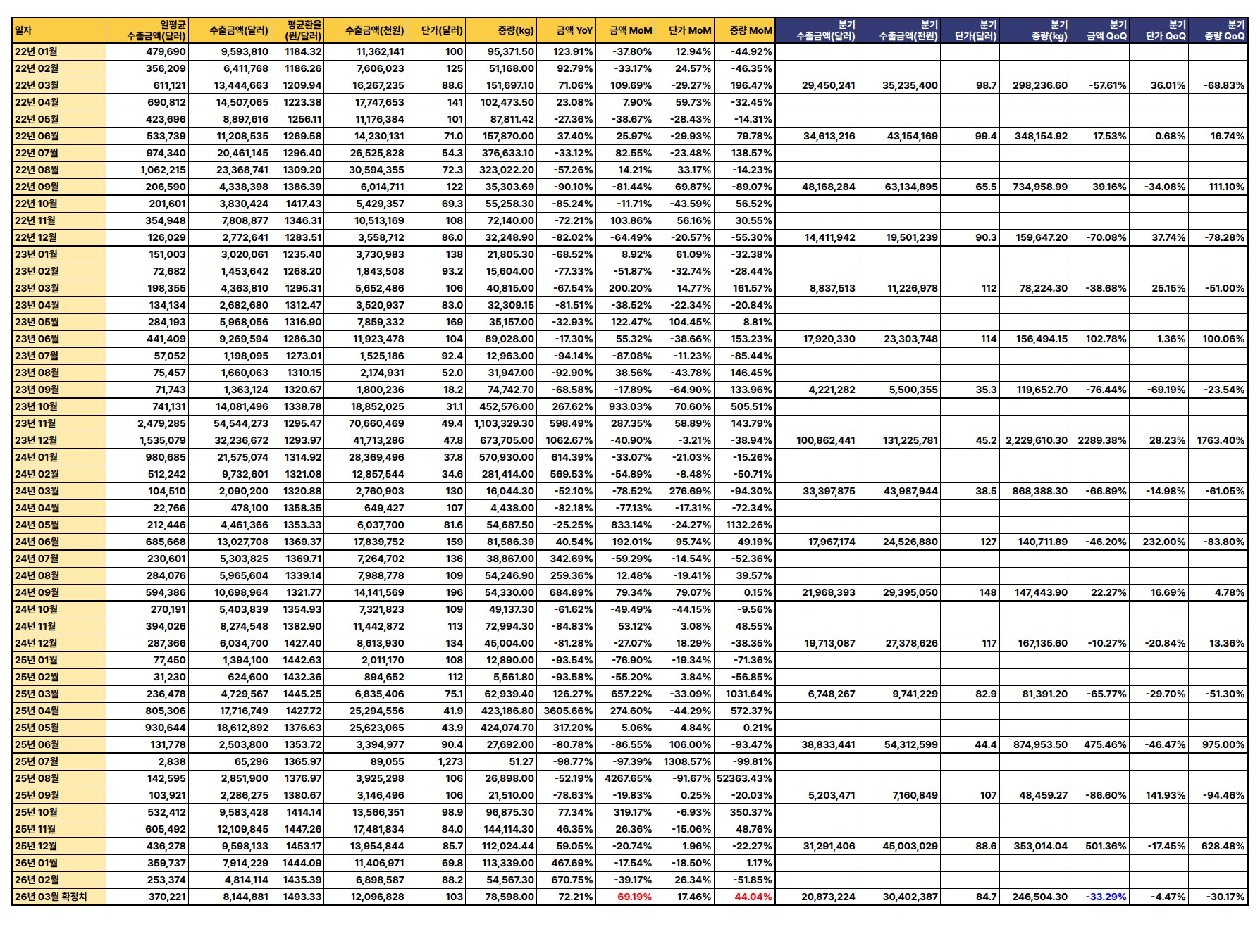 최근 월간 수출액 및 중량은 큰 폭으로 증가했으나, 최신 분기 데이터(2026년 1분기)는 직전 분기 대비 유의미한 감소세를 보여 전반적으로 혼조세를 나타냅니다.