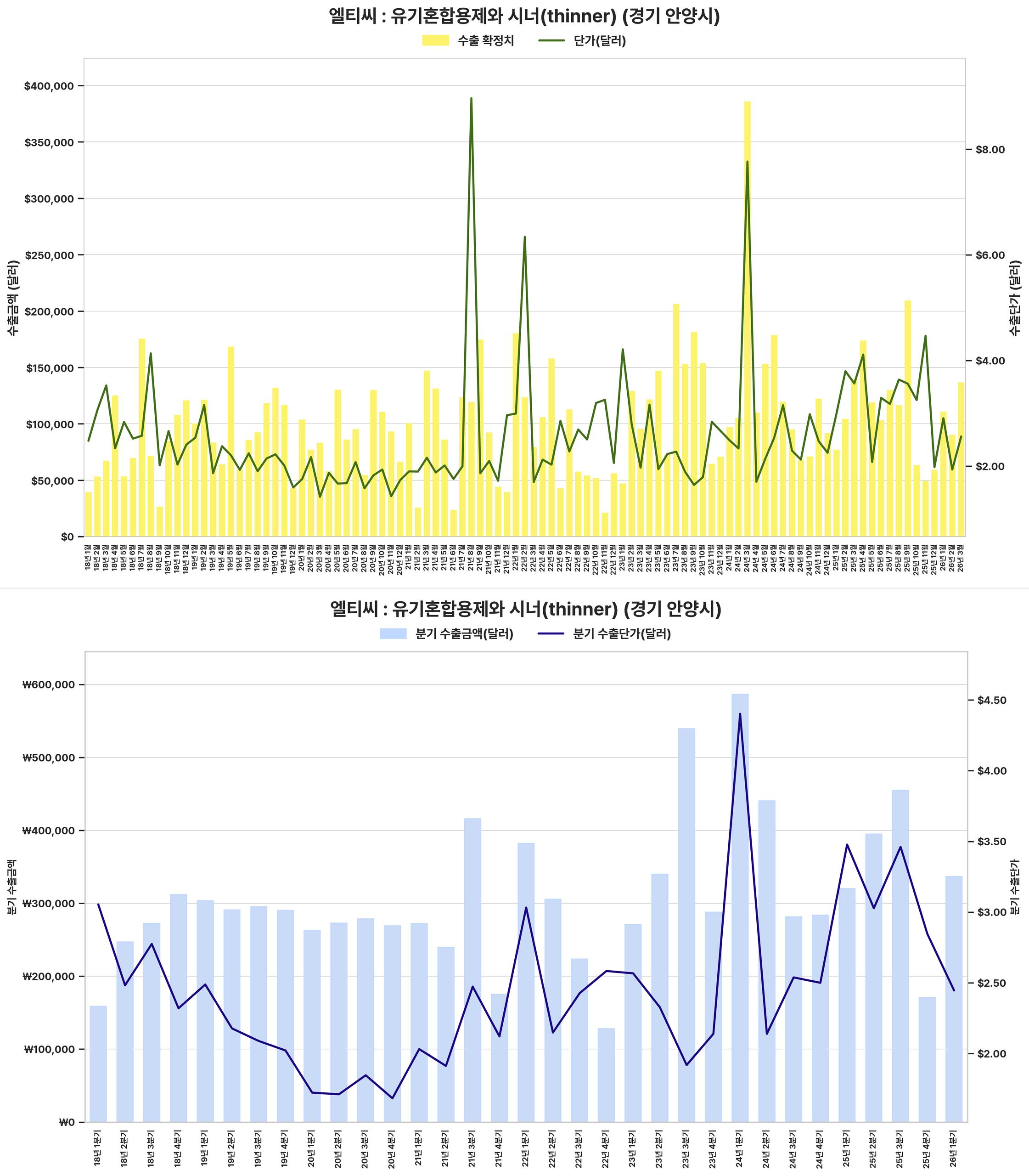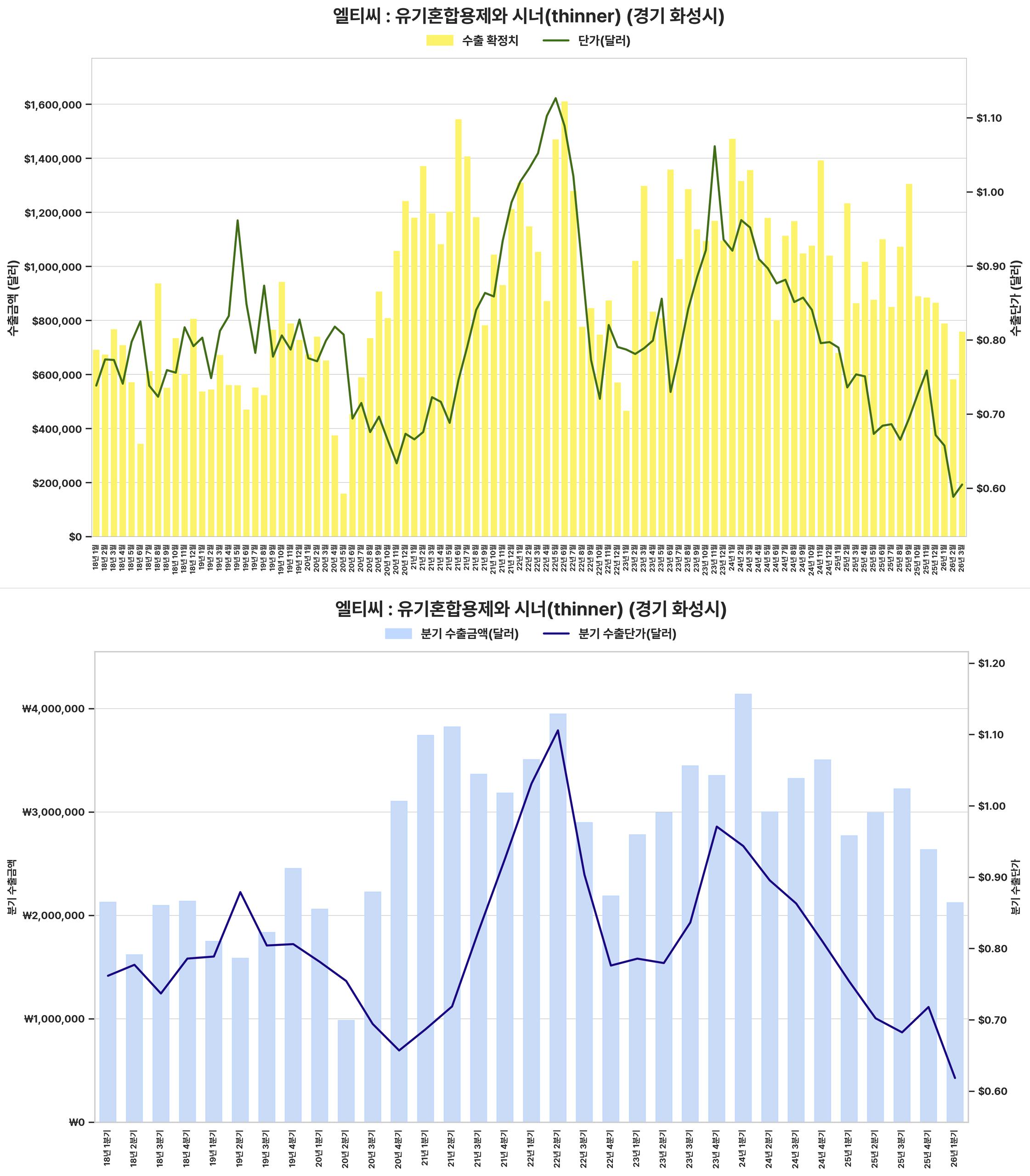 유기혼합용제 및 시너 수출 시장은 높은 변동성을 보이며, 엘티씨의 최근 분기 수출 실적은 감소 추세를 나타내고 있다.